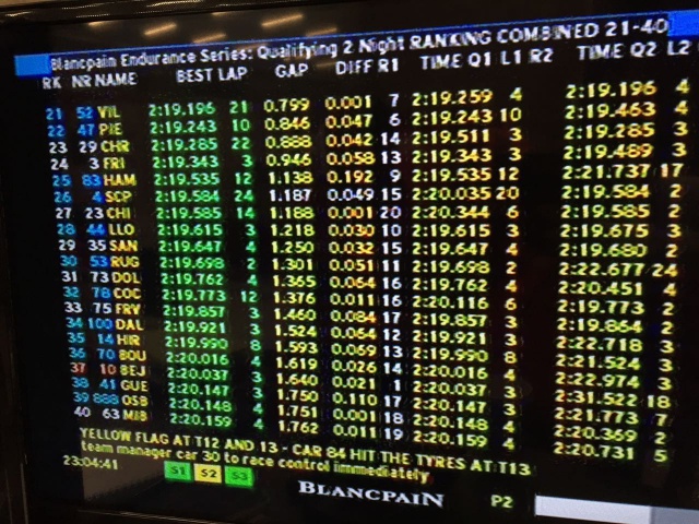 21時45分スタートのナイトクオリファイ(夜間予選)でそのニュータイヤを履いて、1周目に2分19秒5、2周目のセクター1でそのタイムをコンマ3秒上回り、セクター2はほぼ同タイムで来ていましたが、セクター3でトラフィックに引っ掛かってしまい、タイム更新できず。もしこの周にクリアラップが取れていれば、トップ20に入れたかもしれないので、本当に悔しい!!