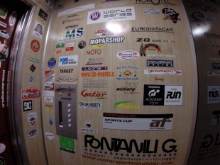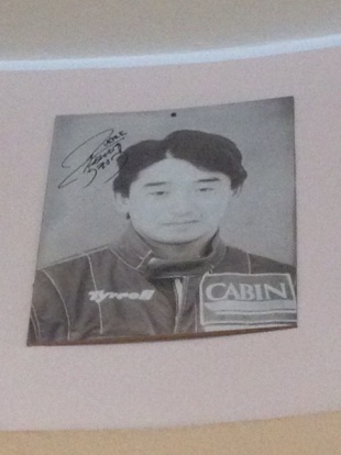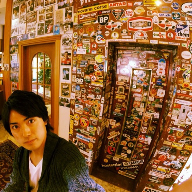 ものすごい数のステッカーと壁中にF1ドライバーの写真!