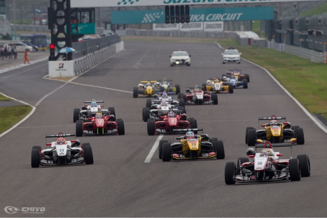 雨が予想されたこの日の鈴鹿サーキットだが、早朝から日中にかけてはおさまり全日本フォーミュラ3選手権第8戦決勝が行われる午後1時40分の時点では、路面は概ねドライの状態。近くまで大きな雨雲が近づいていたが結局レース中に降り出すことはなく、各マシンはドライタイヤで17周のレースに挑んだ。