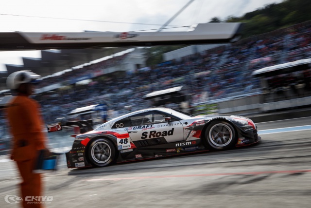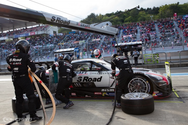 4月に開幕したスーパーGT 2017シーズンは第2ラウンドを迎え、ゴールデンウィーク恒例の富士スピードウェイ500kmレースが開催。この日は公式予選が行われた。GT500クラス全メーカーが新車両を投入した今季は勢力図が昨季とは異なり、開幕戦ではこれまでのような速さを見せることができなかった46号車「S Road CRAFTSPORTS GT-R」だが、その後約1ヵ月のインターバルの間、ライバルとの性能差を埋めるべく開発が進められた。そして午前中に行われた公式練習では終盤の専有走行時間帯に千代勝正が予選シミュレーションアタックを行い、クラス3番手のタイムをマーク。開幕戦で果たせなかったQ2進出に向けて期待が高まった。