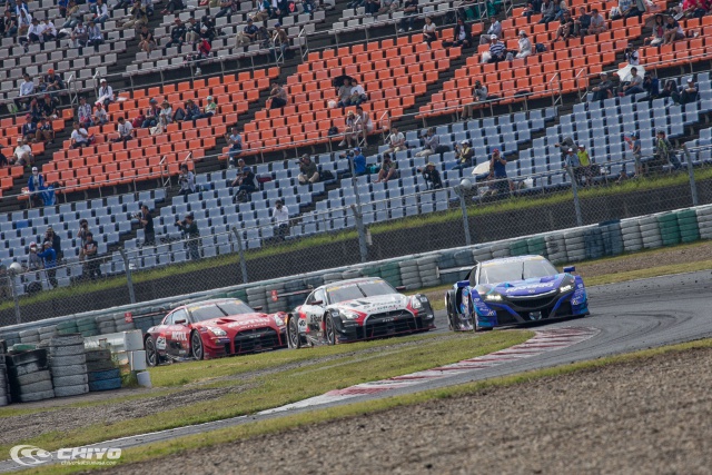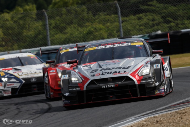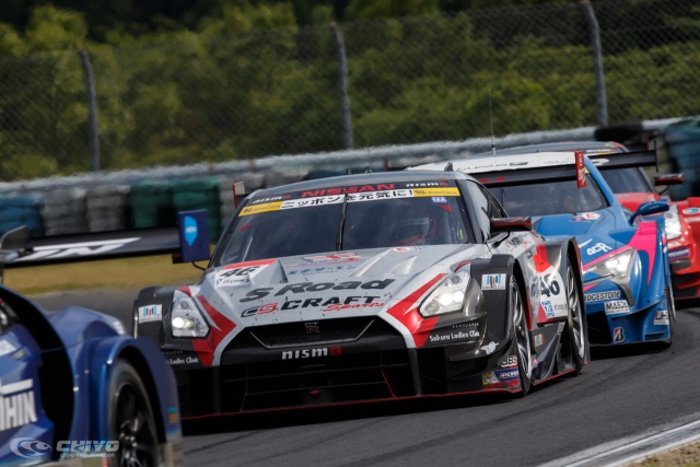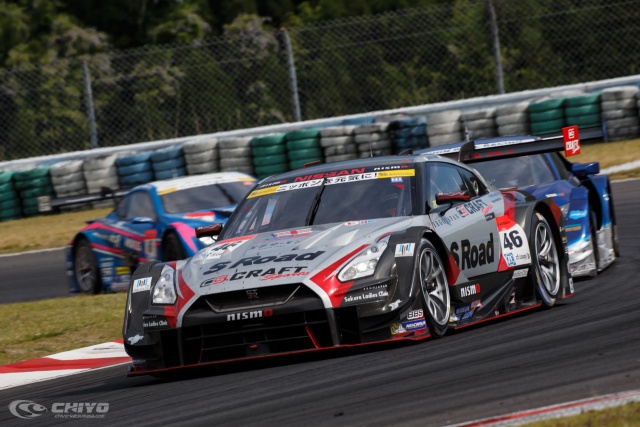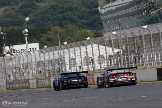 パレードラン、フォーメーションラップの後レースはクリーンなスタートが切られ、オープニングラップでのGT500クラスの順位変動はなし。本山哲がスタートドライバーを務める46号車「S-Road CRAFTSPORTS GT-R」も2位をキープした。その後、序盤トップにはやや離されていく展開となるが5周目にセーフティカーが入ったことで一旦そのギャップが無くなる。一方で後続も近づくことになり、ここから2位争いは混戦に。21周目、GT300クラスに引っかかってしまった46号車は4位へと順位を下げてしまった。