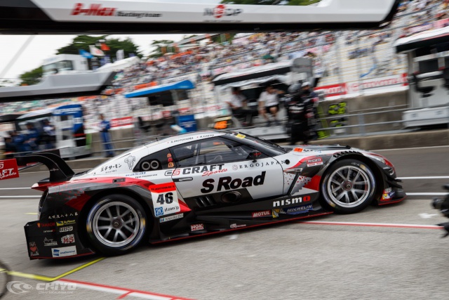 5月の連戦から約2ヵ月のインターバルを経て、スーパーGT2017シリーズはスポーツランドSUGOで第4戦を迎えた。ここから富士の第5戦、鈴鹿の第6戦と、約1ヵ月の間に3レースが行われることになる。前回の第3戦オートポリスを4位でフィニッシュし今期初ポイントを獲得した46号車「S-Road CRAFTSPORTS GT-R」タイトル争いに生き残るためには、この“真夏の3連戦”で着実にポイントを重ねトップグループに追いつく必要がある。しかし、その緒戦となるSUGOでのファーストセッションとなる午前の公式練習ではセットアップが思うように進まず、最後の占有走行での予選アタックシミュレーションはクラス13位となり、午後の予選に向け不安を残す事となった。