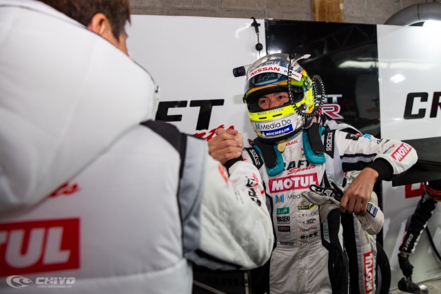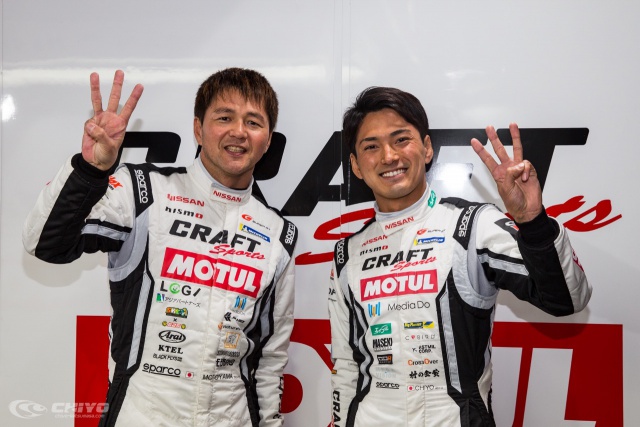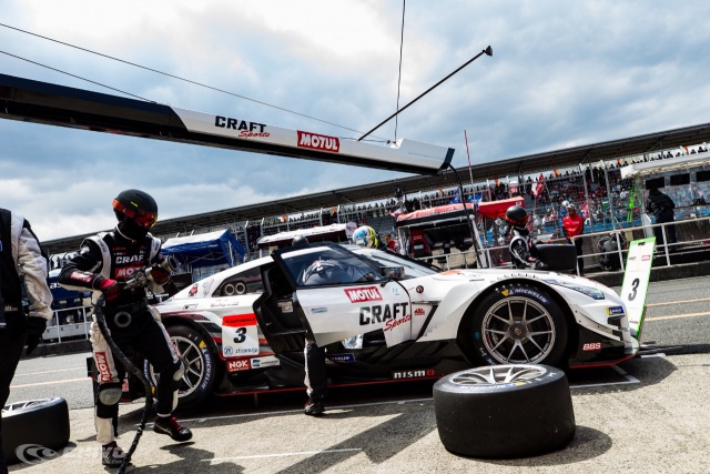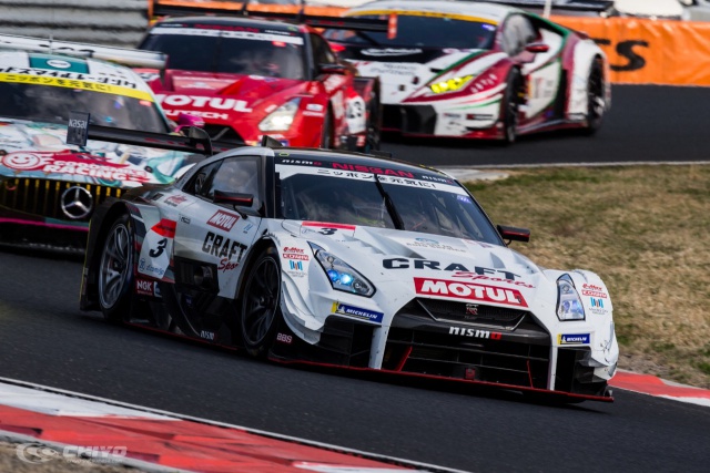 GT500のデビュー戦を3番手という好位置からスタートさせる3号車「CRAFTSPORTS MOTUL GT-R」は、本山 哲が前半スティントを担当した。そしてスタートでは新スタート方式に混乱したのかイン側で前に詰まる形で2台に先行を許すも、スティント序盤はタイヤと燃料をセーブする作戦に切り替えたことが奏功し、15周目あたりから徐々に挽回していく。ジャンプスタートで前の2台がドライブスルーペナルティを取られたことで25周目4位に浮上すると27周目には3位に5秒差、32周目には3秒差、34周目には2秒差、35周目には1.7秒差まで挽回し38周目にピットイン。表彰台圏内再浮上は後半スティントの千代 勝正に託された。