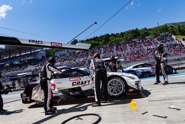 ゴールデンウィーク恒例のSUPER GT第2戦が、富士スピードウェイで行われた。今季GT500クラス初参戦ながらデビュー戦で7位入賞を果たし、トップカテゴリーで戦えることを証明した3号車「CRAFTSPORTS MOTUL GT-R」には今回、さらなる期待がかかる。その第2戦は初日からイレギュラーな展開となった。この日の富士スピードウェイは朝から深い霧に包まれ、数度のディレイを経て午前中の公式練習は中止に。そして各チームの監督が集まりミーティングを行った結果、午後に30分間の練習走行を行った後に20分間の1セッションに短縮された予選が行われることになった。3号車は予選に出走する千代勝正が練習走行を実施。短い時間の中で予選に向けたセットアップとリハーサルを行い、約1時間半後にスタートする予選に備えた。
