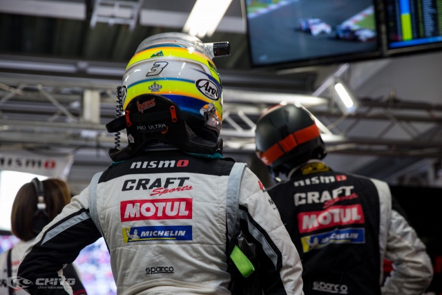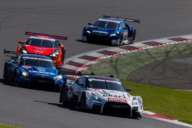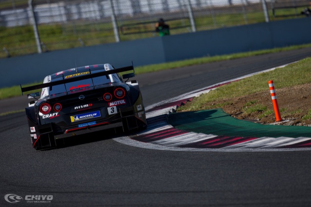 富士スピードウェイはこの日、朝から晴天となり、前日よりも気温、路面温度ともに上昇。500kmに及ぶ長い戦いは、ドライコンディションの下で午後2時40分にスタートした。2回のドライバー交代をともなうピットインが義務づけられたこのレース、7番グリッドから挑む3号車「CRAFTSPORTS MOTUL GT-R」は、千代 勝正がスタートドライバーをつとめた。前日、路面温度がレースのひとつのカギを握ると言っていた千代だったが、その気温は予想よりも高くなり、3号車はレース序盤から苦戦を強いられることになった。