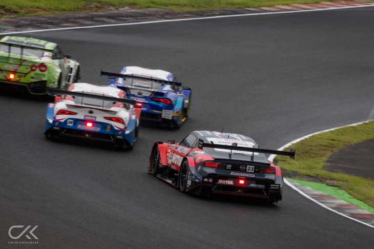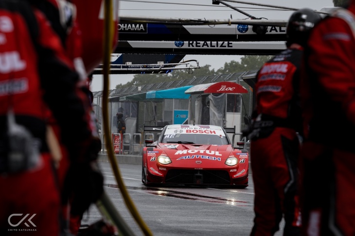 GT500クラスの15台はすべてレインタイヤを選択。4周目にセーフティーカーが離れて、レースはリスタートした。千代 勝正がスタートドライバーをつとめる9番手の23号車「MOTUL AUTECH Z」は序盤、中団グループの混戦の中で浮上、後退を繰り返しながら10位前後をキープして上位進出のチャンスを伺いながら、走行を続けていた。