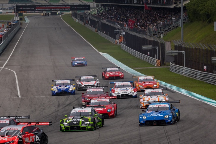 12年ぶりにSUPER GTの舞台として復活したセパン・インターナショナルサーキットでの2025シーズン第3戦、決勝は気温33℃、路面温度42℃のコンディションで午後4時30分にスタート。1台がマシントラブルでスタートできず、また中団の2台が1周目に接触し大きく後退と、波乱の幕開けになった。